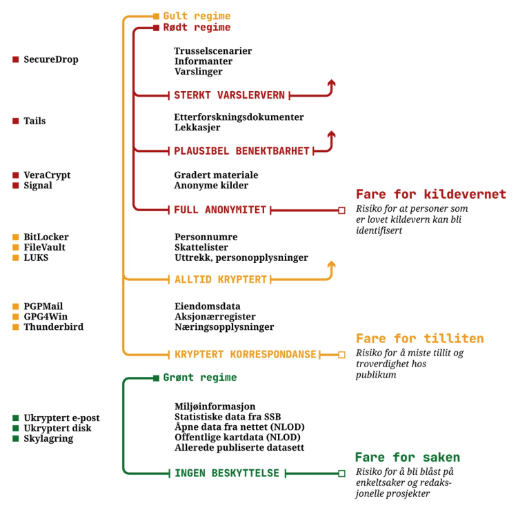I gult regime legger vi oss på et sikkerhetsnivå som primært retter seg mot å forhindre at upublisert materiale kommer på avveie. Her befatter vi oss mest med kryptering og ikke med anonymisering.